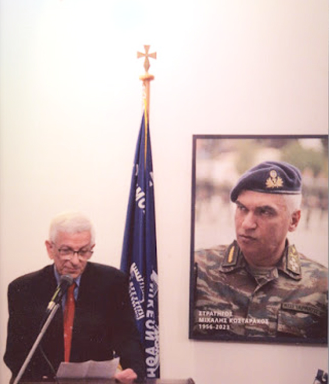 Σας ευχαριστώ λοιπόν ιδιαιτέρως, γιατί και από αυτό εδώ το βήμα, μου δίνεται η ευκαιρία να πω μερικά λόγια για τον επίτιμο Α/ΓΕΕΘΑ, Στρατηγό Μιχαήλ Κωσταράκο, ο οποίος έφυγε από κοντά μας πριν από ένα περίπου χρόνο. Θα προσπαθήσω μέσα από λίγες καθαρές κουβέντες, αλλά και προσωπικές εμπειρίες, να αποδώσω όσο καλύτερα μπορώ, το αποτύπωμά του στις Ένοπλες Δυνάμεις και την Πατρίδα μας.